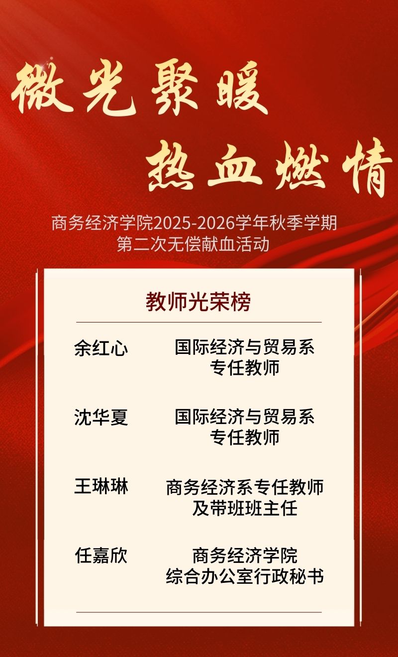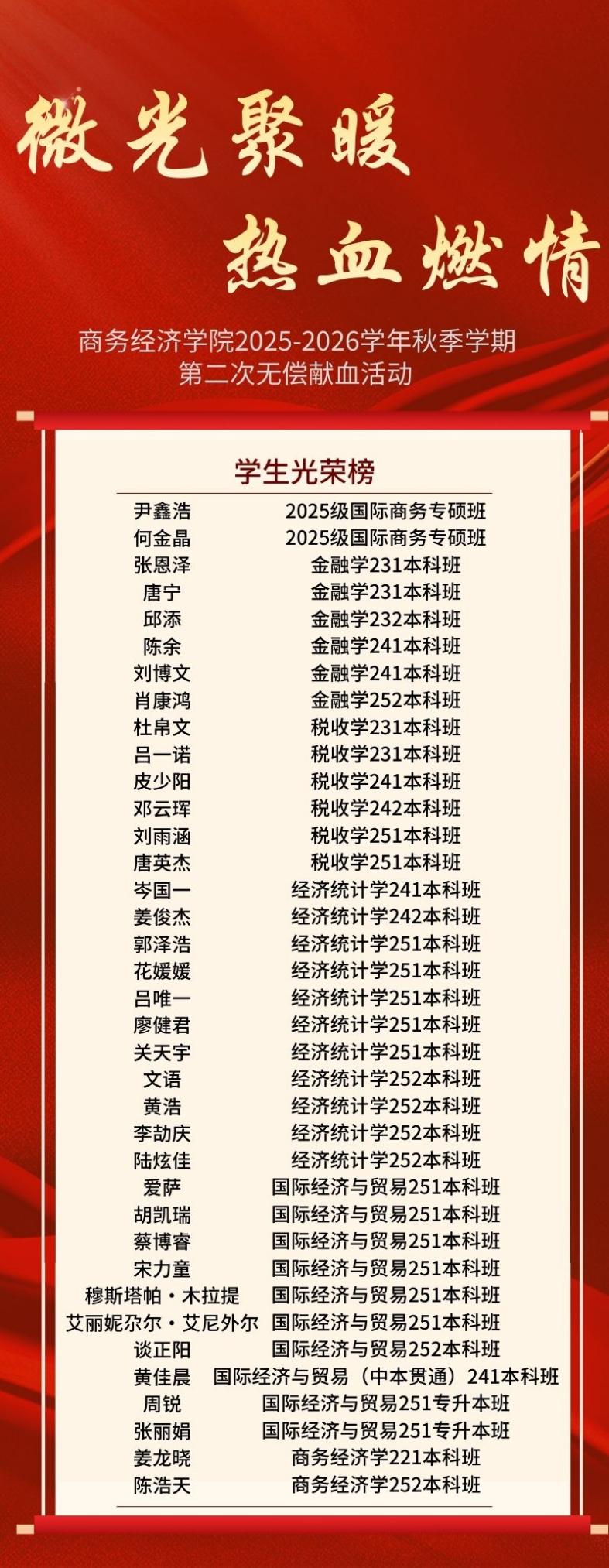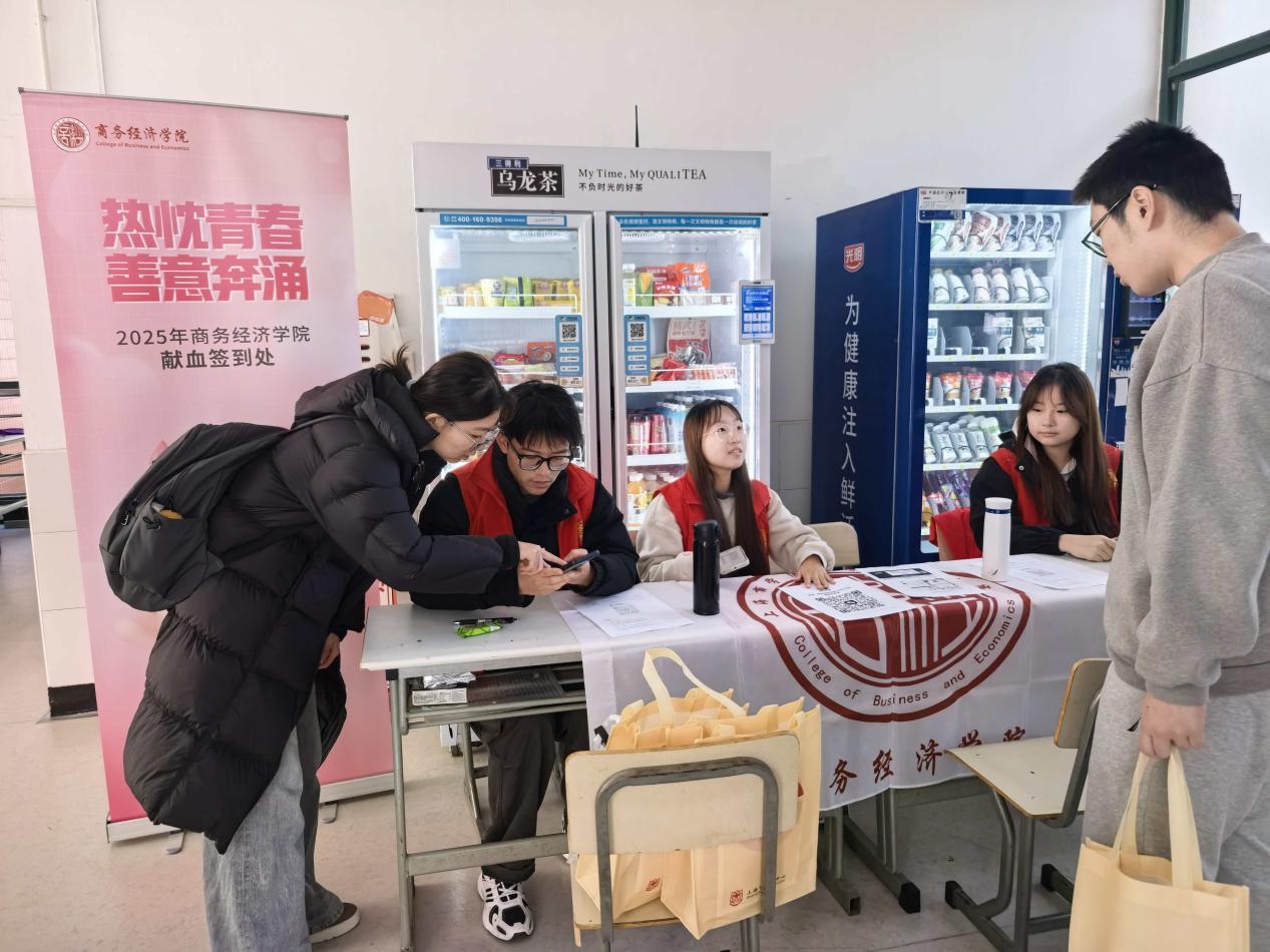 涓涓热血流淌青春赤诚,熠熠担当践行时代使命。未来,我院将继续号召广大同学积极参与无偿献血活动,激励更多商经学子用热血诠释奉献精神,用行动温暖社会,共同构筑守护生命的坚实防线,彰显新时代青年的担当。