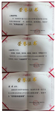 图为我校获得“优秀组织奖”、参赛团队学生被授予“非遗推荐官”称号、教师获得“优秀指导教师奖”的荣誉证书