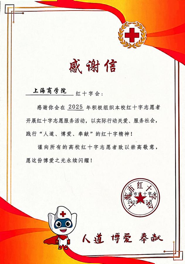 同时,因我校红十字会积极组织志愿者开展红十字志愿服务活动,成效显著,获上海市红十字会感谢信。未来,我校红十字会将继续秉持“人道、博爱、奉献”的红十字精神,以提升学生急救意识、传递公益力量为核心目标,持续深耕志愿服务领域。上商红十字会将不断丰富志愿服务内容与形式,常态化开展急救知识宣讲、技能实操培训等特色活动,让急救知识真正走进每一位学生心中,让红十字精神在广大学子的志愿服务实践中薪火相传。