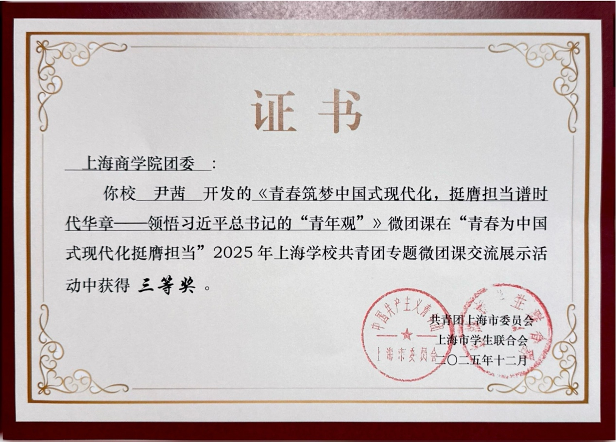 近日,由共青团上海市委员会、上海市学生联合会主办的2025年上海学校共青团专题微团课展示交流活动圆满落幕,活动吸引了全市高校及高中阶段学校的广大青年教师与学生积极参与。我校团委挂职团干部、马克思主义学院青年教师尹茜申报的微团课作品《青春筑梦中国式现代化,挺膺担当谱时代华章——领悟习近平总书记的“青年观”》荣获三等奖,体现了我校青年教师扎实的理论素养与出色的教学风采。
